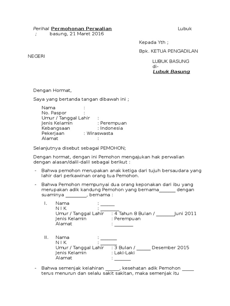 Contoh Permohonan Perwalian from imgv2-2-f.scribdassets.com Setelah kesepakatan bersama, maka dibuatlah surat pernyataan persetujuan yang menjadi jaminan dan bukti autentik sebelum kesepakatan atau. Demikian surat pernyataan perwalian ini saya buat dengan sebenarnya, dan untuk dapat dipergunakan dalam hal proses penyelesaian prona tahun 2012. Contoh surat pernyataan perusahaan, surat perjanjian, serta cara membuat surat pernyataan. Semua contoh ini ada karena kebutuhan akan surat ini memang besar. Biasanya surat pernyataan ditulis oleh seseorang untuk dirinya atau untuk orang lain karena sudah pernah atau belum melakukan suatu hal. Surat kuasa pengurusan bermaterai cukup (jika pengurusan melalui pihak lain). Meskipun hal yang dicantumkan dalam surat pernyataan bisa saja sederhana, tapi banyak orang yang masih tidak tahu, bagaimana cara membuat surat pernyataan? Keterangan sehat jasmani dan rohani dari puskesmas/rs.