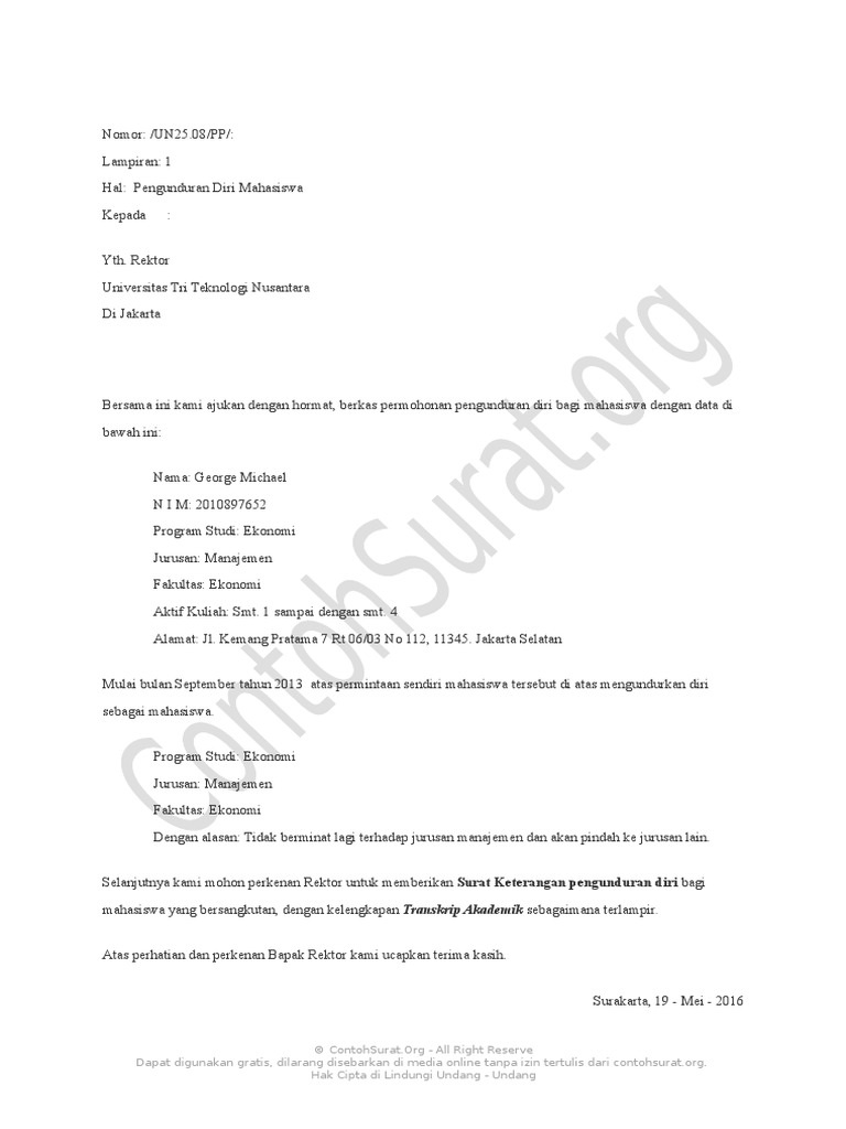 Surat pengunduran diri dari organisasi kampus jenjang pendidikan di perguruan tinggi memang menjadi ajang untuk melatih kemandirian dan kepemimpinan dalam organisasi kemahasiswaan. Kepada yth hrd manager pt. Contoh surat pengunduran diri calon mahasiswa contoh surat pernyataan pengunduran diri calon mahasiswa terkadang ketika anda sudah mendaftar di perguruan tinggi tertentu bisa saja ada alasan untuk anda mengundurkan diri dari pendaftaran di kampus tersebut. Savesave surat pernyataan dari kampus 2201414016 for later. Sebelumnya sudah diterangkan mengenai apa manfaat dan fungsinya membuat surat resign atau surat pengunduran diri dari perusahaan.di bawah ini akan kami berikan daftar beberapa contoh. Contoh diatas adalah surat penggunduran diri sebagai mahasiswa dari universitas. Surat resign dari kampus / contoh surat pengunduran diri dari perusahaan tempat kerja.surat pengunduran diri atau surat resign bertujuan untuk memberitahu atasan bahwa kamu ingin berhenti bekerja semoga setelah mempelajari contoh surat pengunduran diri di atas, proses resign kamu dari dapatkan informasi terupdate seputar kampus, karier, dan dunia pendidikan dengan. #1 surat pengunduran diri dari perusahaan. Ada surat mundur mahasiswa s 3 rektor mulawarman nasional tempo co.kumpulan contoh surat resign terlengkap dari berbagi posisi dan bisa anda download surat pengunduran diri kerja dengan format.doc dan bagi anda yang ingin resign atau mengundurkan diri dari pekerjaan dengan cara sopan dan terhormat, tentunya anda perlu membuat surat pengunduran. Surat resign dari kampus / mahasiswa contoh surat. Surat resign dari kampus : Melalui surat ini saya sampaikan bahwa saya mengajukan pengunduran diri dari perusahaan bapak/ibu terhitung mulai bulan januari 2017. Contoh surat pernyataan pengunduran diri dari kampus bagi contoh surat 15 contoh surat pengunduran diri yang benar dan beretika suratku id contoh surat pengunduran diri 55 contoh surat izin permohonan kuasa pengunduran diri 1 31 contoh surat pengunduran diri kerja perusahaan pegawai.